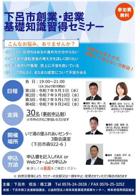 岐阜県よろず支援拠点のコーディネーター3名も講師を務めますので、お近くにお住まいの方、ぜひご参加ください。
